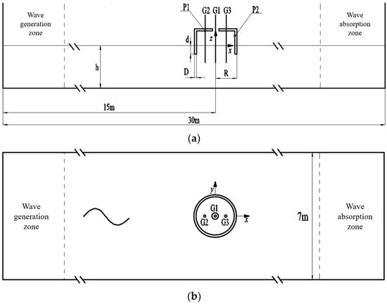 A 3D numerical water flume for analyzing the performance of the OWC device is subsequently established. The positive direction of the x-axis is set as the direction of wave propagation, and the fifth-order Stokes wave is used to simulate the wave conditions. The OWC device is placed in a position 15 m away from the incident boundary. The wave generation and absorption zones are configured to eliminate the influence of wave reflection on the experimental results. The water depth h is 1 m, and the draft of the device d is 0.2 m. The overall schematic of the numerical model is shown in Figure 4. In instances where the width of the flume exceeds five times the width of the device, the impact of the flume wall on the experiment is rendered negligible [39]. Consequently, the width of the flume is designated to be 7 m. Three wave height detection points, G1 (0 m, 0 m), G2 (−0.25 m, 0 m), and G3 (0.25 m, 0 m), are established to detect the wave surface height inside the air chamber. Two pressure monitoring points, P1 (−0.25 m, 0.39 m) and P2 (0.49 m, 0.3m), are set at the inner wall and the top of the chamber to detect the air pressure inside the chamber. The average of the obtained values is taken as the overall pressure value.