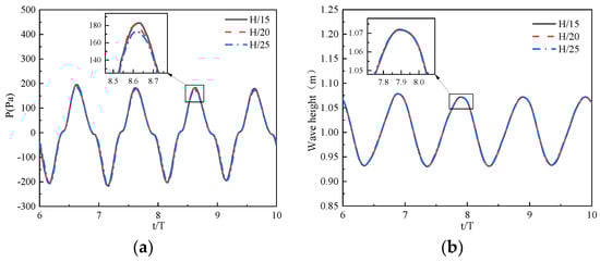 The entire numerical flume is meshed using the built-in automatic meshing technique in STARCCM+. The grid size setting is a critical factor in the process of numerical simulation which determines the efficiency of the numerical simulation. To accurately capture the wave motion and the output power of the air chamber, the mesh size in the vertical z-direction of the free surface region and the OWC opening region needs to be refined. Three mesh sizes, 15/H, 20/H, and 25/H, were selected to analyze the mesh convergence. Figure 5 represents the variations in wave surface height and pressure inside the OWC device with time for different grid sizes (wave height H = 0.2 m, period T = 1.8 s).