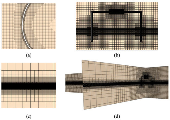 Mesh configuration for the numerical wave flume: (a) mesh distribution surrounding the structure (top–down view); (b) mesh distribution surrounding the structure (frontal view); (c) distribution of the mesh along the water depth direction; and (d) general overview of the mesh distribution.