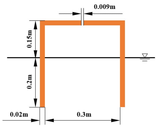 To validate the dependability of the developed numerical model, the experimental results of the interaction model between waves and offshore fixed OWC devices conducted by Iturrioz et al. [46] were used for verification. The overall dimensions of the OWC device are shown in Figure 7, with a water depth of 0.6 m. The incident wave parameters were established with a wave height H = 0.08 m and period T = 1.3 s.