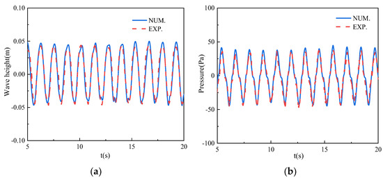 Comparison chart of simulation results and model experiment results: (a) wave height and (b) pressure.