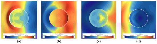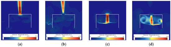 Airflow velocity in the OWC device during a wave cycle: (a) 1/4 T; (b) 1/2 T; (c) 3/4 T; and (d) T. (H = 0.2 m; T = 1.5 s).