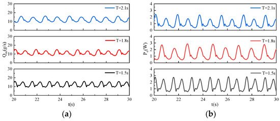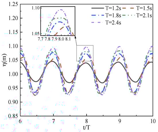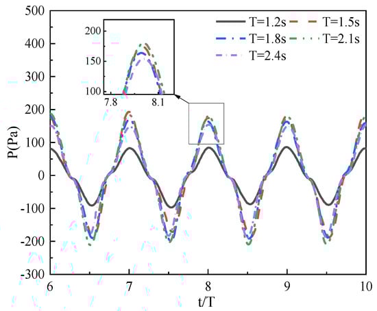 To study the hydrodynamic effects of different incident wave periods on the OWC device, the opening ratio was set as , and the incident wave height was specified to be 0.2 m. The other parameters were set as follows: h = 1 m, d = 0.2 m, R = 1 m, and D = 0.01 m.