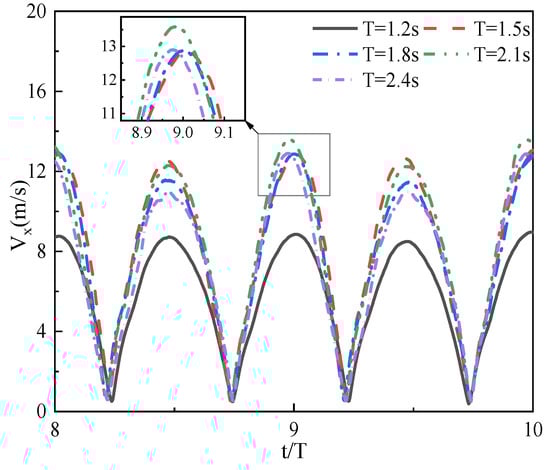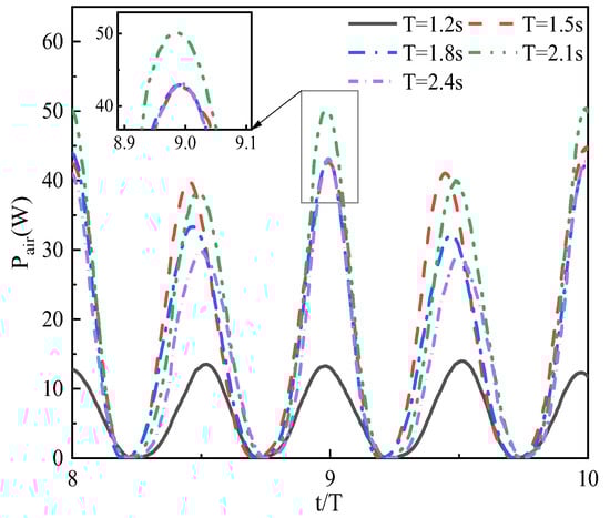Figure 11 shows the wave height versus time inside the air chamber at different incidence wave periods, and the time is dimensionless for comparative analysis so that the horizontal coordinate is set as . It is evident that the wave surface height in the air chamber varies approximately sinusoidally, with the amplitude of the crests exceeding that of the troughs. Furthermore, as the incident wave period increases, the maximum value of the wave height experiences a corresponding rise. The wave height can reach 1.1 m at T = 2.4 s, while the minimum is only 1.04 m at T = 1.2 s.