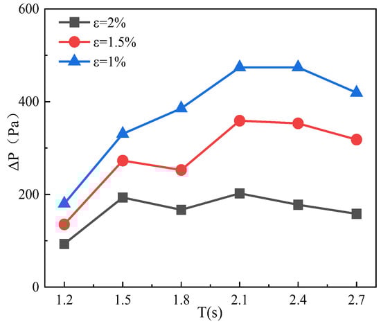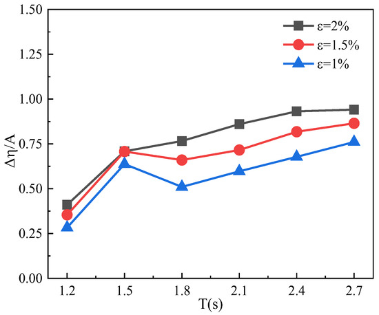 In this section, in order to investigate the effect of different opening sizes on the hydrodynamic characteristics of the OWC, three opening ratios are set as 2%, 1.5%, and 1%, corresponding to opening radii of = 0.075 m, = 0.06 m, and = 0.05 m, respectively. The wave height is set as 0.2 m, and other setup parameters are kept constant. Figure 16 shows the variation in the average wave surface elevation inside the chamber with the incident wave period for different opening ratios. Different opening ratios have a large impact on the hydrodynamic characteristics of the OWC device. As the opening ratio decreases, which means the damping keeps increasing, the average wave surface elevation inside the air chamber keeps decreasing, and the overall trend is the same. The minimum value is observed at an opening ratio of 1% and an incident wave period of 1.2 s. The average wave surface elevation ratio to the incident wave amplitude is 0.283. The maximum value is attained at = 2% and T = 2.1 s, reaching 0.9415. It is noticed that near the resonant period of the device, the oscillation of the water column inside the air chamber is more intense, and the average wave surface elevation changes more significantly. At the high-period region, the ratio of the average wave surface elevation to the incident wave amplitude gradually converges to 1 [48], which is mainly due to the long wave which can penetrate the OWC more easily.