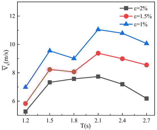 Figure 17 and Figure 18 illustrate variation in the average pressure inside the air chamber and the average airflow velocity at the opening orifice with the incident wave period for different opening ratios, respectively. It can be found that, under different opening ratios, the average pressure inside the air chamber and the average airflow velocity at the opening orifice show the same trend with the incident wave period. Both demonstrate an overall change process of increasing first and then decreasing, and both attain their maximum value at T = 2.1s. As the opening ratio decreases, both pressure and air velocity increase, contrary to the tendency of the surface elevation inside the chamber. The pressure within the air chamber reaches 474.11 Pa and the average airflow velocity is 11.05 m/s at an opening ratio of 1% and a period of 2.1 s. Conversely, the minimum values are obtained at a 2% opening ratio with a 1.2 s period, which are 93.23 Pa and 5.27 m/s, respectively.