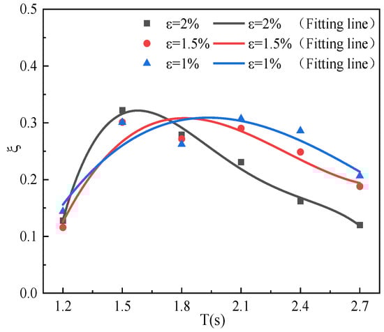 The numerical simulation results of the hydrodynamic efficiency of the OWC at different incident wave periods and the corresponding fitting line are shown in Figure 15. The figure demonstrates that hydrodynamic efficiency initially rises and subsequently declines with the period. The effective period bandwidth of the efficiency is marked with a dashed line in the figure, and it can be found that the effective period bandwidth of the device is mainly in the range of 1.3 s to 2.1 s. The maximum hydrodynamic efficiency point was obtained at T = 1.5 s, reaching 0.322, from which it is inferred that the resonant period of the OWC occurs around T = 1.5 s. In contrast, the minimum point was obtained at T = 3 s, which was only 0.088. When the wave period is small, the reflection effect is strong, and most of the energy is reflected when it meets the front wall of the OWC and cannot enter the interior of the OWC, thus lowering the captured energy and hydrodynamic efficiency. When the wave period is large, the transmissivity of the waves will increase, and the waves will propagate directly through the OWC system, resulting in a decrease in the efficiency of the OWC system.