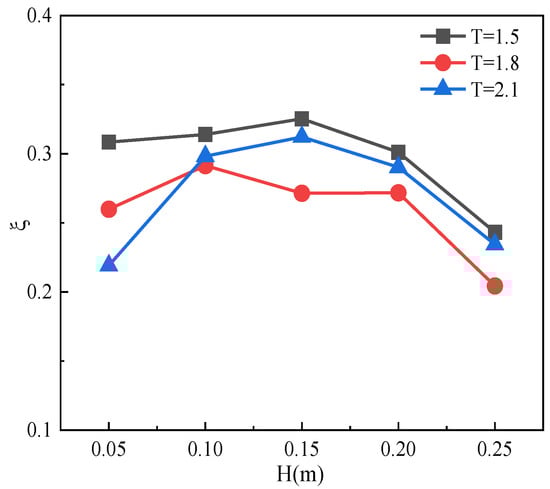 This section investigates the effects of different incident wave heights on the hydrodynamic efficiency of the OWC device. The opening ratio is 1.5%, and five wave height cases are selected (H = 0.05 m, 0.1 m, 0.15 m, 0.2 m, 0.25 m). All other variables remain unchanged. Figure 20 illustrates the relationship between hydrodynamic efficiency and incident wave height. It can be noticed that the overall hydrodynamic efficiency initially increases with the rise in incident wave height, attains a maximum value at the critical wave height , and subsequently diminishes with an increase in wave height. The critical wave heights are not exactly the same across different incident wave periods, and the maximum efficiency values reach 0.33 and 0.31 at T = 1.5 s and T = 2.1 s when is taken at 0.15 m, respectively. At T = 1.8 s, is obtained at 0.1 m, and the maximum efficiency value is 0.29.