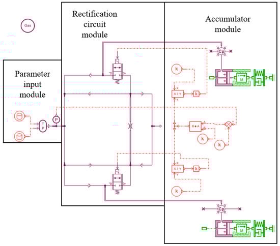 Assuming that the check valve and switching valve are either completely open or completely closed and there is no pressure loss, the positive pressure accumulator’s initial volume is set as 0.5 L, while the negative pressure accumulator’s initial volume is set as 10 L due to the need to form negative pressure. To investigate the impact of the accumulator on the system’s energy conversion, a model of the rectifier loop PTO system without accumulators is constructed, as illustrated in Figure 23. This model will henceforth be referred to as the conventional PTO system.