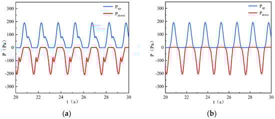 The pressure up- and downstream of the turbine: (a) novel PTO system and (b) conventional PTO system.