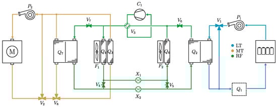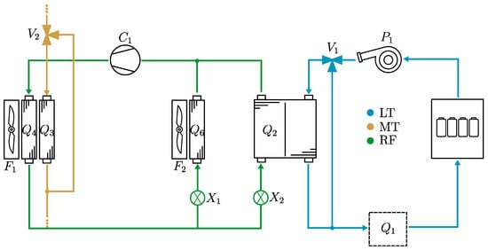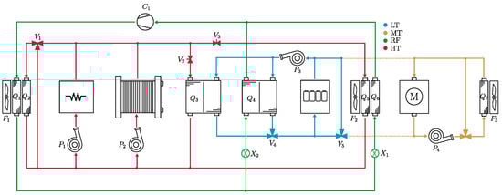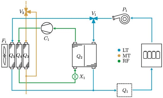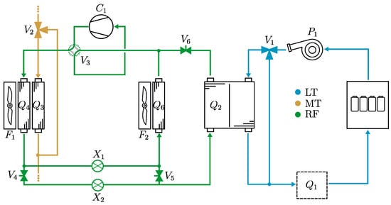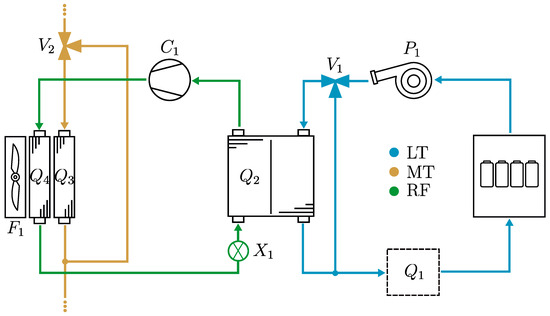 Figure 1 shows an early TMS design with a considerable range reduction in cold climates. The system carries three fluid loops: a low temperature (LT) circuit for cooling the battery pack, a medium temperature (MT) circuit for cooling the motor and power electronics (not shown in the figure), and a refrigerant (RF) circuit tasked to transfer heat from the battery loop to the ambient environment, through the chiller (