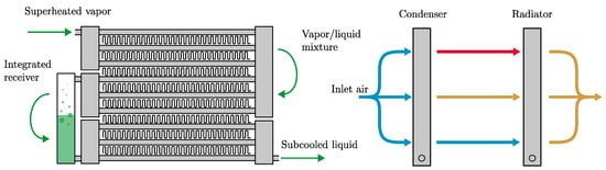 An air-to-refrigerant heat exchanger working as a condenser is shown in