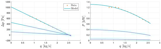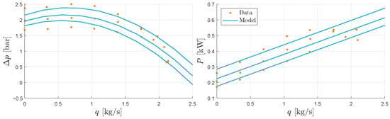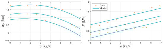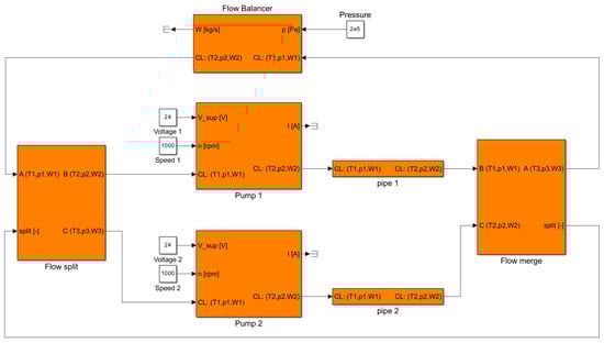 Figure 13 was implemented. The coolant properties (temperature, pressure, and flow) were propagated through the models in vector format. In addition to the inlet coolant conditions, the pump models took as inputs a voltage and a desired speed. A pressure boost was calculated according to the pump models described above, and the output coolant state was output to the next component models.