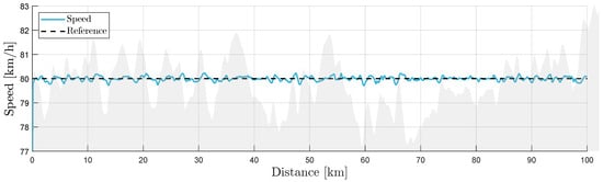 The vehicle speed was controlled by a PI regulator set to a reference of 80 km/h. The velocity tracking simulation result of a 40-ton battery electric truck is shown in