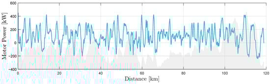 To maintain the velocity reference when driving resistance forces act on the vehicle, the electric machine must either motor or act as a brake, where energy is recuperated. The electric machine power signal is shown in