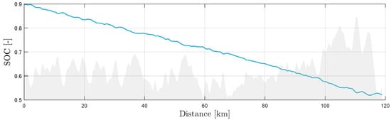 Figure 26. The mission started at 90% capacity. After 120 km, the state of charge reached fifty percent, suggesting a range of approximately 250 km.