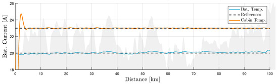 3/h flow of air through the cabin. The TMS was tasked to maintain temperature reference levels, in this case 23 °C for the cabin and 20 °C for the battery. The results for the pure electric heating case at