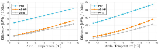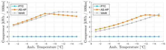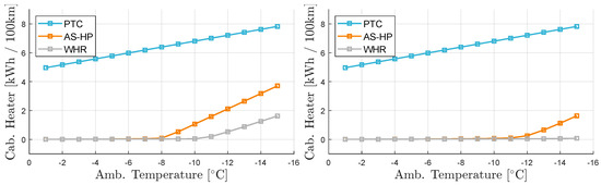 The crossover points for the compressor work matched the points at which additional electrical heating was required to maintain the temperature setpoints for the cabin and battery. For both lighter and heavier vehicles, the air-source heat pump system needed additional heating at higher ambient temperatures. The heavy vehicle equipped with waste-heat recovery did not need any electrical cabin heating for temperatures down to −15 °C.