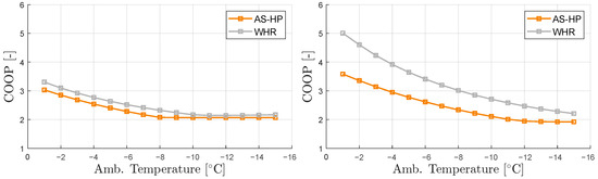 The heat pump performance worsened for both heat pump systems as temperature decreased, as shown by the coefficient of performance in