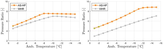 The improvement in performance can be explained by the ratio of the compressor and electric heater work. The compressor work was higher for the lighter vehicle for both waste-heat recovery and the air-source heat pump, since the heavier vehicle produced more waste heat, requiring less external heating for the battery pack. For higher temperatures, the waste heat system required less compressor work than the air-source system, and vice versa for lower temperatures. For the lighter and heavier vehicles these crossover points occurred at °C and °C.
