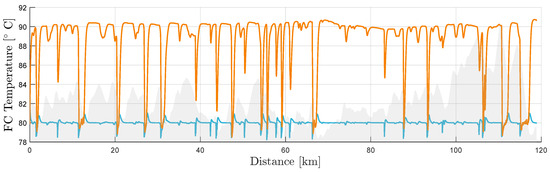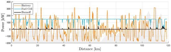 The control system was simple and used only single input–single output proportional–integral (PI) regulators to satisfy the mission objectives. The velocity target was 80 km/h and maintained by adjusting the torque demand on the electric motors. For the battery electric vehicle, the DC bus was maintained at seven hundred volts by adjusting the battery current only, while for the fuel cell hybrid, the bus was regulated by a combination of power sources, whose ratio of contribution was determined by the operating conditions. If the battery was charging at maximum capacity (a situation that might occur when driving downhill) the fuel cell stack output was temporarily reduced to allow maximum recuperation.