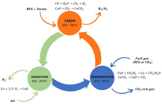 Scheme of the CASOH process for the decarbonization of BFG and the production of H2-rich gas.