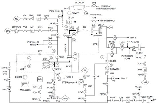 Figure 2 shows the Process Flow Diagram (PFD) for the CASOH pilot. This PFD illustrates the pilot equipment along with the supply lines for blast furnace gas (BFG), natural gas (NG) (used both for the CASOH process and the flare), steam, and nitrogen (N2), all sourced directly from the ArcelorMittal GasLab utilities network. Additionally, the air and carbon dioxide (CO2) required for the process are provided by a compressor (COMP) and pressurized cylinders, respectively. The PFD also includes the cooling water circuit for the reactor’s product gases, as well as the gas sampling system linked to two gas analysers, enabling the measurement of gas composition at various points within the pilot plant. BFG is fed into the pilot via BLOWER 1 at up to 4 bara, near ambient temperature, and saturated with water. It enters through the on/off valve V13, with flow regulated by the mass flow meter MF1 and control valve FCV1. The non-return valve NRV1 prevents reverse flow, while pressure-regulating valve PRV2 limits pressure to 1.5 bara (i.e., the maximum pressure allowed according to gas preheater specifications). During specific operations, BFG can bypass the reactor and flow directly to the flare by adjusting valves V17 and V12. Thermocouple T3 monitors the BFG (or NG) temperature before entering the reactor. To meet ATEX safety requirements, the preheaters (PREH in Figure 2) are positioned over 1.5 m from the BFG entry. This distance has been gained by means of a two-meter refractory-lined pipe that connects the preheaters to the reactor inlet, omitted from the PFD for simplicity.