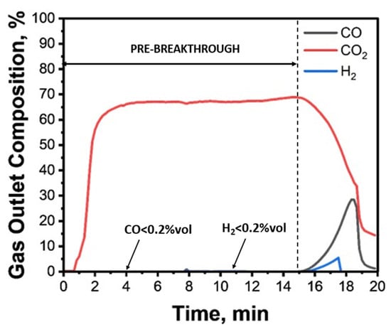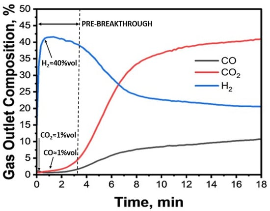 After 5 min, the carbonation front approached the end of the reacting bed, resulting in a gradual decrease in H2 concentration alongside an increase in CO and CO2 concentrations. By just over 10 min into the operation, the CO2 sorbent was nearly fully carbonated and ceased capturing CO2. From that point, the fixed bed functioned as a conventional WGS reactor, producing a gas with approximately 22% vol. H2, 10% vol. CO, and 40% vol. CO2 in nitrogen.