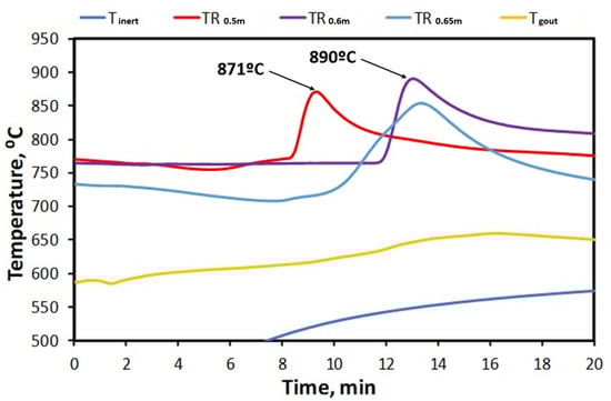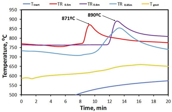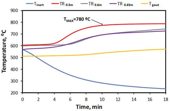 On the other hand, Figure 9 illustrates the temperature evolution at various points in the reactor during the CuO reduction stage. The initial temperature profile of the bed was around 600 °C. As observed in previous stages, during the first half of the stage, the temperature measured by thermocouples located in the latter half of the bed remained constant. This indicates that the reduction front advanced ahead of the heat exchange front, so all the heat generated from the reduction of CuO to Cu remained in the solids behind the reaction front. After 9 min of operation (approximately half of the total duration of the stage), the thermocouple positioned at the middle of the bed (TR_0.5 m) experienced a sudden temperature increase as it was reached by the reduction front. This sharp temperature rise confirms the rapid kinetics of CuO reduction with CO and H2 present in the BFG. Thermocouples located further along the bed showed a similar trend, reaching a maximum temperature of up to 820 °C at TR_0.65 m. As seen in other stages, once the reaction front moved through a section of the reactor, the converted solids stabilized at this maximum temperature, creating a heat plateau. In contrast, the lower section of the reactor, occupied by inert alumina, exhibited a different temperature behaviour. As with the CASOH stage, the temperature (Tinert) gradually decreased when the BFG + N2 gas mixture was introduced, since the BFG was fed directly without preheating.