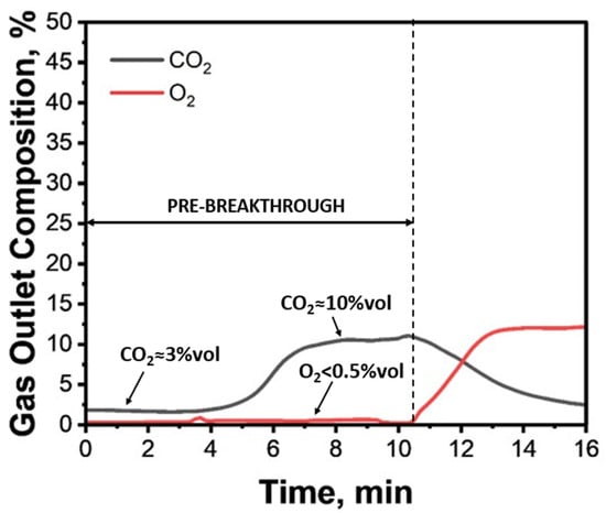 Figure 6 presents the composition of the reactor’s exit gas during this stage. During the initial 10 min of operation, the oxygen in the inlet gas was almost completely consumed, with O2 concentrations falling below 0.5% vol. This indicates the extremely rapid kinetics of copper oxidation, even with such short gas residence times. After this period, as the oxidation front reached the end of the bed, the O2 concentration in the exit gas began to rise quickly, matching the inlet value (12% vol.) within just 3 min, marking the breakthrough period. This sharp oxidation profile highlights the excellent reactivity of the copper material with oxygen.