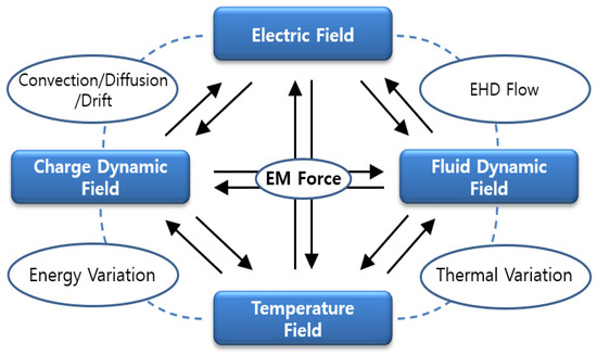 Schematic of multiphysics for space charge transport in a dielectric liquid.