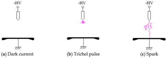 - Sattari, P.; Gallo, C.F.; Castle, G.S.P.; Adamiak, K. Trichel Pulse Characteristics—Negative Corona Discharge in air. J. Phys. D Appl. Phys. 2011, 44, 155502. [Google Scholar] [CrossRef]
