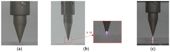 The negative corona discharge is generated by the potential difference between the cathodically connected needle electrode and the flat plate electrode. Unlike the positive corona, the negative corona discharge occurs immediately following the Trichel pulse corona. The Trichel pulse is caused by secondary electron emission from the cathode. When a Trichel pulse is generated, a red glow near the settling electrode develops outward from the cathode surface, pulsating rapidly and continuously throughout the circuit. Figure 3 shows the development of the negative corona discharge as the voltage increases [16,17].