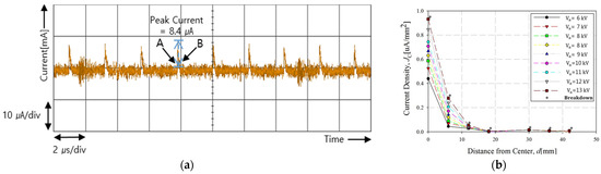 As shown in Figure 7a, the Trichel pulse corona was measured on a tip electrode with a radius of 100 μm, placed 5 mm from the flat-cell plate electrode. When a negative dipolar DC voltage of 6.9 kV was applied, the current ranged from 10 to 100 μA, with a frequency of 400 kHz. Figure 7b shows the current density at each cell electrode, measured at the flat-cell plate electrode after the Trichel pulse corona was initiated. The highest current density was observed in the channel perpendicular to the needle electrode, and it decreased with distance from the center. In Figure 7a, the growth time of the Trichel pulse corona (marked as A) was 97.5 ns, while the decay time (marked as B) was measured at 20 ns. The growth time of the Trichel pulse required approximately 4.9 times more time than the decay time.