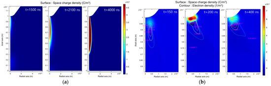 Figure 8a shows the simulation results of the streamer and the propagation process of a monopolar corona, where the space charge distribution propagated from the needle to the flat plate electrode over time. When a DC voltage exceeding 3 kV was applied to the tip electrode of the simulation model, a local electric field exceeding 10–100 MV/m was formed. Further, the space charge began to diffuse and propagate. When a negative DC voltage was applied and the electric field around the needle exceeded 10 MV/m, Trichel pulse corona was generated, as shown in Figure 8b. The space charge originated at the needle and propagated radially up to approximately 200 ns under the influence of secondary electron emission. When the charge reached insulation breakdown, it released thermal energy and propagated to the flat plate.