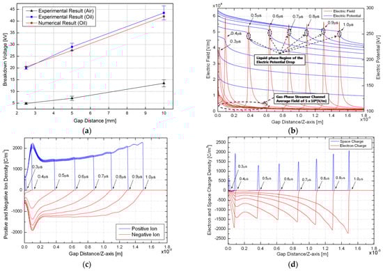 Figure 9a shows the measured breakdown voltages of air and oil as the medium in the electric discharge model of the flat-tip plate model. It can be seen that the measured breakdown voltage of oil discharge is approximately five times that of air discharge. Figure 9b shows the electric field distribution dynamics along the electrode axis between the flat-tip plate electrodes predicted by the two-phase model at 0.1 μs intervals between t = 0.3 μs and t = 1.0 μs. The electric field distribution at t = 0.3 μs represents the Laplacian electric field distribution generated by the flat-tip plate electrode geometry. A very interesting and important feature of the electric field dynamics generated by the two-phase model is the fact that the peak of the electric field distribution does not occur at the tip of the needle electrode, as in the Laplacian field distribution, but at a point in the oil gap between the needle and the spherical electrode, and that the position of the peak of the electric field shifts with time from the needle electrode to the plate electrode. At the beginning of the simulation, a high-field region was formed at the settling pole along the Laplacian field distribution. After approximately 0.4 μs, a field wave propagated with a field strength of 5.5 × 108 V/m. A sharp potential change occurred at the peak of the field wave, attributed to the two-phase flow medium. Figure 9c shows the distribution of cations and anions as a function of time during streamer propagation from the needle electrode (x = 0) to the flat plate electrode. The cations in the streamer channel were relatively more abundant than the anions, attributing to charge generation due to the ionization of molecules. Figure 9d shows the propagation of the injected electrons in space by field and thermal electron emissions. Compared with the results shown in Figure 2, the space charge was concentrated in the space where the peak of the field wave was formed. Free electrons migrated to the needle electrode at a faster rate than the ions. The ionization of molecules by the electric field was considered to be the main source of free charge generation. The charges separated from the stable neutral species moved along the electric field in the dielectric and formed space charges owing to the different mobilities of electrons and ions.