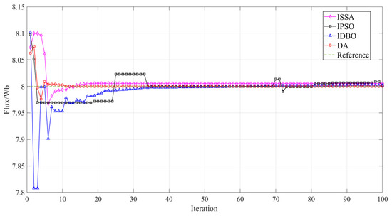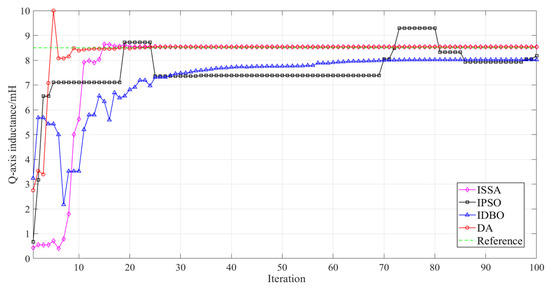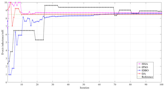 Furthermore, a comparative analysis was conducted on the convergence details of various methods across different parameters. Figure 4 presents the comparison results of the convergence curves of various methods in stator resistance identification, Figure 5 presents the comparison results of the convergence curves of various methods in d-axis inductance identification, Figure 6 presents the comparison results of the convergence curves of various algorithms in q-axis inductance identification, and Figure 7 presents the comparison of the convergence curves of various methods in magnetic flux identification. According to the comparison of the convergence curves of various methods, the proposed DA-based parameter identification methods can converge faster and more stably to the target parameter values during the parameter identification process. A comparison of the proposed DA-based parameter identification method with the underlying algorithm revealed that the former yields more stable and reliable identification results. It is noteworthy that during the recognition process of different parameters, each algorithm experiences oscillations, particularly the IPSO algorithm. This instability can be attributed to the optimization objectives of the underlying algorithms, which were designed to address the overall recognition error. Consequently, this instability can lead to variations in the recognition accuracy of the individual parameters. In contrast, the proposed DA method not only considers the overall recognition accuracy but also ensures the recognition accuracy and stability of individual parameters. The findings of this study demonstrate the efficacy and reliability of the proposed DA parameter identification method for multi-parameter identification of a PMSWG.