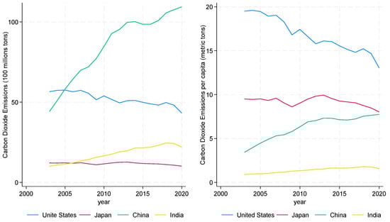 As shown by the World Development Indicators (WDI) data, emerging countries have become the main source of new CO2 emissions, while CO2 emissions in major industrial countries have declined significantly. Among the top ten countries and regions for CO2 emissions, China, India, Indonesia, Russia, Brazil, and Iran are all emerging countries, and their CO2 emissions have increased except Brazil. In Figure 1, China’s total CO2 emissions increased from 4.424 in 2003 to 10.945 billion metric tons in 2020, and CO2 emissions per capita increased from 2.65 in 2000 to 7.76 metric tons in 2020. India’s CO2 emissions increased from 1.012 in 2003 to 2.201 billion metric tons in 2020, and CO2 emissions per capita increased from 0.87 in 2000 to 1.58 metric tons in 2020. In contrast, America’s total CO2 emissions declined from 5.659 in 2003 to 4.321 billion metric tons in 2020, and CO2 emissions per capita declined from 20.10 in 2000 to 13.03 metric tons in 2020. Japan’s total CO2 emissions decreased from 1.214 in 2003 to 1.014 billion metric tons in 2020, and CO2 emissions per capita decreased from 9.94 in 2013 to 8.03 metric tons in 2020. Moreover, CO2 conversion technology, particularly the conversion of CO2 into fuels [2], is rapidly advancing. However, emerging market countries have lagged significantly behind developed countries in technology, making it difficult for them to mitigate CO2 emissions through CO2 conversion technology.