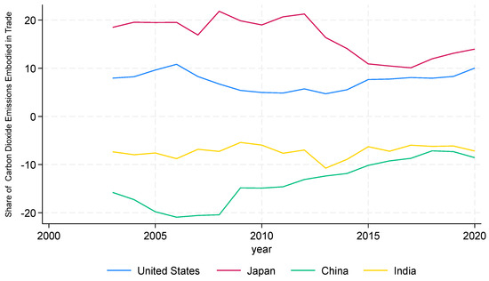What is driving the rapid increase in carbon emissions among emerging market countries? Studies suggest that the surge in economic growth and energy consumption plays a significant role in driving up carbon emissions in these nations [3,4]. However, there are two notable facts in the global carbon emission landscape: the share of CO2 emissions embodied in international trade accounts for 1/4 to 1/3, and rich countries are increasingly outsourcing CO2 emissions. The data from “Our World in Data” on trade-embodied CO2 emissions shows that China and India have consistently been net carbon exporters from 1992 to 2020, but the United States and Japan have been net carbon importers (Figure 2). This trend underscores the significant role that international trade plays in affecting environmental quality, particularly CO2 emissions [5,6,7].