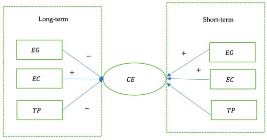 Since bias may occur between the white noise term and the mean differenced independent variables in ARDL models, the traditional ARDL method cannot control for this bias when individual effects are present in panel dataset models. For this reason, this study applies the PMG-ARDL technique [39] to resolve the problem. The method can not only estimate both long-term and short-term parameters at the same time, but it also can effectively handle heterogeneity and mitigate cross-sectional dependence. Nevertheless, the model relies on the assumption of long-term homogeneity, which may not align with reality in some cases, and the setting of the lag order depends on the researcher’s experience or trial.