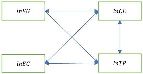 To detect causality, the Dumitrescu–Hurlin causality test was carried out (Table 14). Firstly, two-way Granger causality existed between them (see Table 18). Secondly, no Granger causality was found between economic growth and energy consumption. Finally, economic growth and trade openness had one-way causality, and economic growth was the Granger causality of trade openness, but trade openness was not the Granger causality of economic growth. To illustrate the causal pathways more clearly through which trade openness influences CO2 emissions, Figure 5 shows that trade openness also indirectly influences CO2 emissions through its direct effects on economic growth and energy consumption in addition to the direct impact on CO2 emissions.