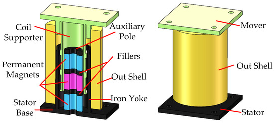 The LVCM exhibited in this paper is a moving coil type to reduce the volume and the mass of its mover. Its stator is composed of three ring permanent magnets, the fillers, the iron yoke, the auxiliary pole, and the stator base. The ring permanent magnets and their filler are hollow circular cylinder shapes, and the magnetization direction of three ring permanent magnets is the longitudinal direction of this LVCM, aiming at reducing the motor size and the number of permanent magnets.