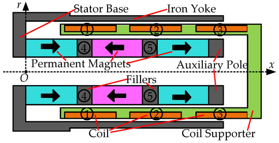 As Figure 2 shows, the three permanent magnets are magnetized in the longitudinal direction(x); the magnetic flux lines straightly pass the gap (where the coils are set in) through Filler ④, Filler ⑤, and the auxiliary pole. The stroke of this LVCM is only 1.5 mm, so Filler ④ is always pointed at Coil ①, Filler ⑤ is always pointed at Coil ②, and the auxiliary pole is always pointed at Coil ③ during this tubular LVCM running. The direct currents in Coil ① and Coil ③ have the same direction; the direct current in Coil ② is reversed. The running direction of the motor mover will change when the direct current directions of Coil ①/③ and Coil ② are interchanged. This tubular VCM is an axially symmetrical structure, so the analytical model (exhibited in Figure 3) only takes half of the cross-section x-r, which is shown in Figure 2.