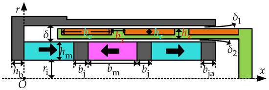 In Figure 3, hm is the radial thickness of three permanent magnets and bm is their axial length; the two fillers and the auxiliary pole have the same radial thickness as three permanent magnets, the axial length of two fillers is bj, the axial length of the auxiliary pole is bja, the radius of the hollow structure inside the inner part is ri, and the axial thickness of the stator base is hb. hc is the radial thickness of three coils, and bc is their axial length. hz and bz are the radial thickness and the axial length of the parts of the coil supporter between coils, respectively. δ is the radial length of the air gap between the inner part and the outer part of the mover stator, δ1 is the radial length of the mechanical air gap between the motor mover and the outer part of the motor stator, and δ2 is the radial length of the mechanical air gap between the motor mover and the inner part of the motor stator. According to this analytical model, the distribution of the magnetic flux in the gap of this tubular LVCM is calculated, is its radial component, and is its axial component.