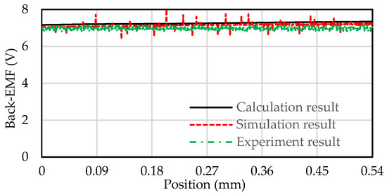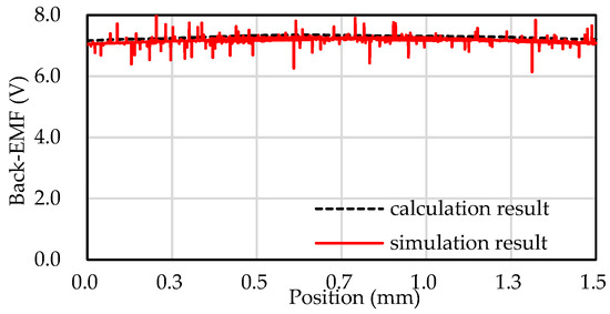 where, −(bc − bj)/2 ≤ t ≤ (bc − bj)/2. The curve drawn by Formula (4) is exhibited as the calculation result in Figure 5, and the other curve is the back EMF obtained by the simulation when the motor mover runs 1.5 mm.