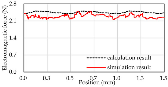The curve drawn by Formula (6) and the curve of the electromagnetic force obtained by the simulation are both shown in Figure 6 when the motor mover runs 1.5 mm.