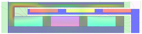 The end effect suppression can help to reduce the thrust ripple of this tubular LVCM, and it is beneficial to improve the accelerated speed (F/m, m is the mass of the motor mover). This tubular LVCM adopts the method of adding the auxiliary poles and the magnetic conductive stator base to suppress its end effect, which is simple and effective. The distribution of the magnetic flow in the analytical model (exhibited in Figure 3) is shown in Figure 7.