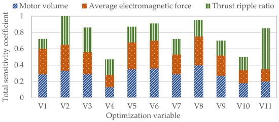 The sampling analyses of the eleven optimization variables are completed, combined with the finite element calculations, and the total sensitivity coefficients of the eleven optimization variables for the three motor performances (motor volume, average electromagnetic force, thrust ripple ratio) are shown in Figure 9.