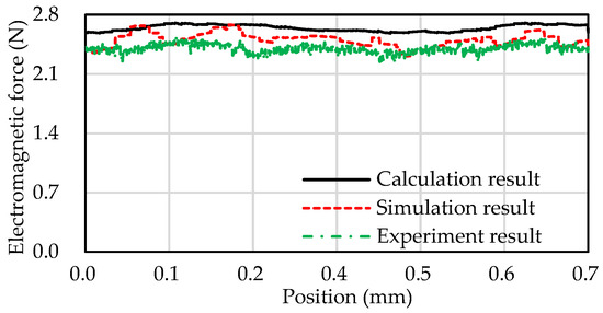 The average values of the calculation result, the simulation result, and the experiment result in Figure 12 are 2.64 N, 2.50 N, and 2.41 N, respectively. The error of the experiment result to the simulation result on the average electromagnetic force is 3.60%, which is acceptable. The thrust ripple ratio of the calculation result, the simulation result, and the experiment result in Figure 12 are 3.53%, 2.87%, and 3.01%, respectively. The simulation result of the thrust ripple ratio is obtained by the global optimization, so it is much better than the calculation result. In addition, the experiment result of the thrust ripple ratio is higher than the simulation one by 4.87%, due to the machining error and the inconsistency of material properties. However, it still is lower than 5%, and the test accelerated speed is 150.63 m/s2, which can meet the demand.