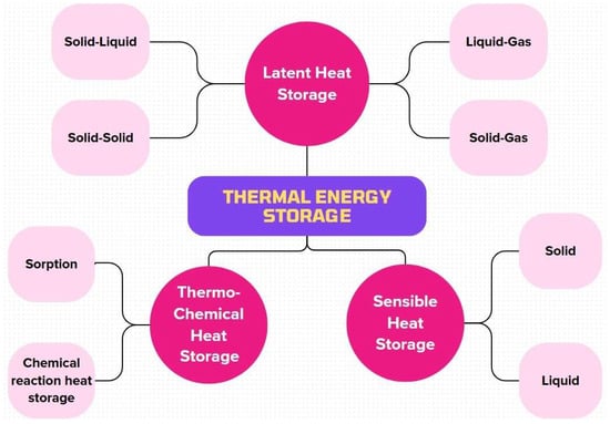 TES systems can be broadly classified into three main categories: sensible heat storage (SHS), latent heat storage (LHS), and thermochemical heat storage (TCHS), as illustrated in Figure 2. SHS retains energy by increasing the temperature of a medium, such as water or rocks without inducing a phase change. LHS relies on phase change materials (PCM) which absorb and emit energy while in phase transition [18]. These transitions include solid–liquid, liquid–gas, solid–gas, and solid–solid changes. Among them, solid–liquid PCMs are increasingly used for their reliability and high energy storage capacity. While liquid–gas and solid–gas transitions offer higher energy density, they are often limited by complex system requirements. Solid–solid transitions, which involve changes in crystalline structure, present unique advantages such as no leakage, enhanced long-term stability, and simpler containment. Polymers and specific alloys are examples of materials that make this method suitable for compact and dependable energy storage applications. TCHS uses reversible chemical reactions or sorption processes to store and release heat, offering high energy density and long-term storage capabilities [19].